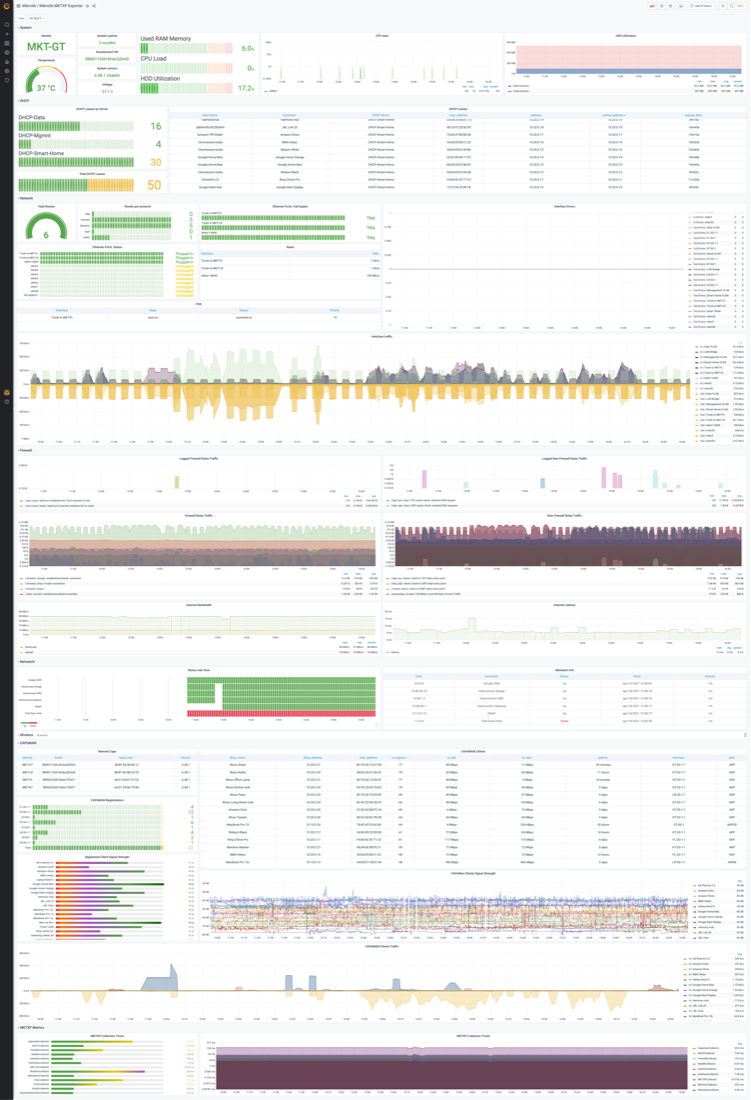Now with your RouterOS metrics being exported to Prometheus, it's easy to visualize them with this Grafana dashboard